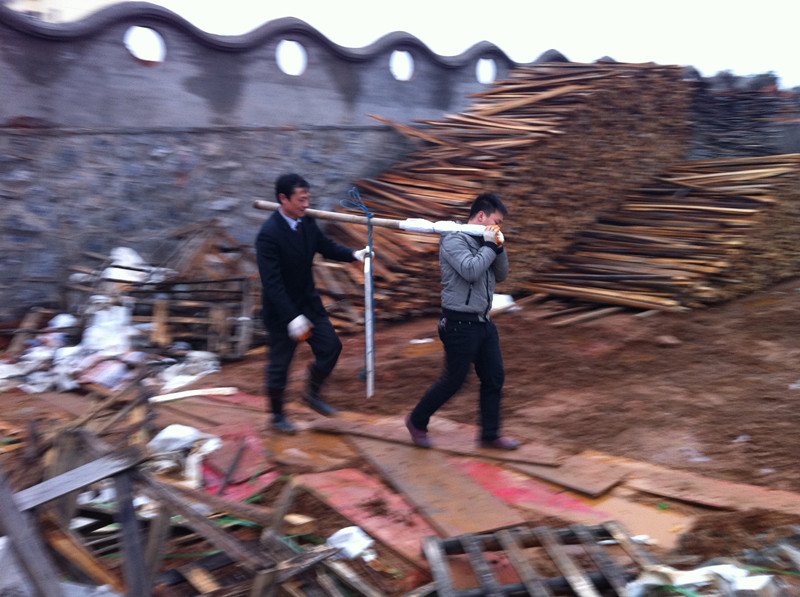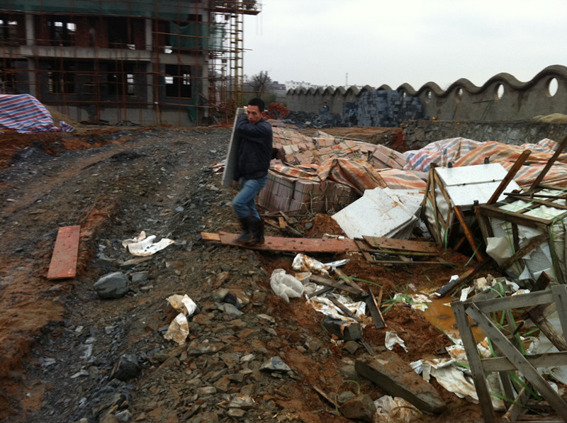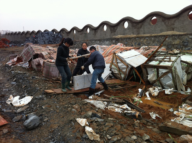 共青城儿童村项目管理人员冒雨工作场景