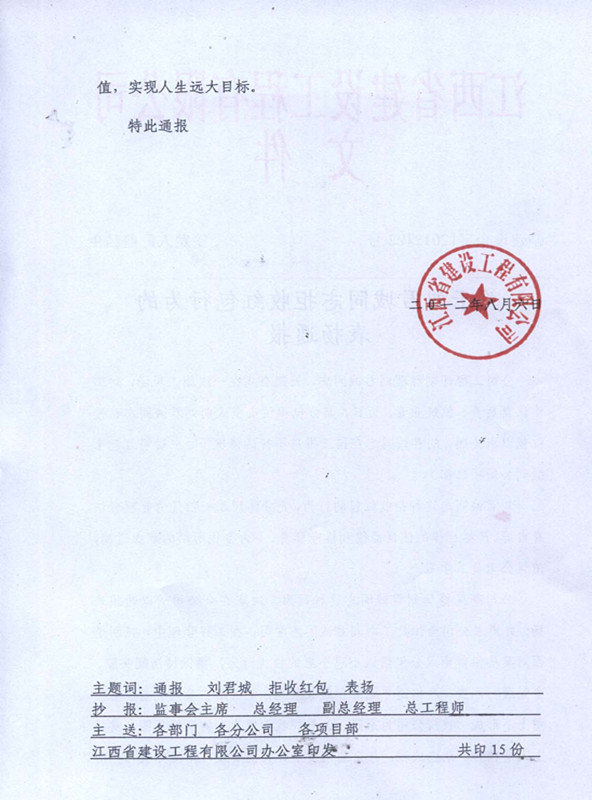 关于刘君诚同志拒收红包的表扬通报